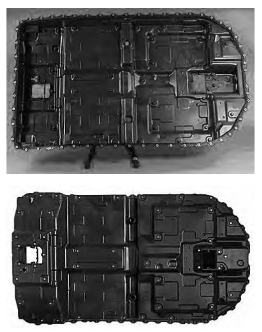 1.6×1.4m 电池箱盖的顶侧(上)和底侧(下),用短玻纤增强 PP制成(来源:SABIC)