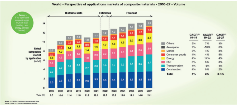 根据JEC观察2022-2027最新报告显示,截止2022年底,全球市场估计为1270万吨(用于生产复合材料部件的复合材料)。它代表着价值410亿美元的复合材料市场,以及对应着价值1050亿美元的复合材料部件组装市场。