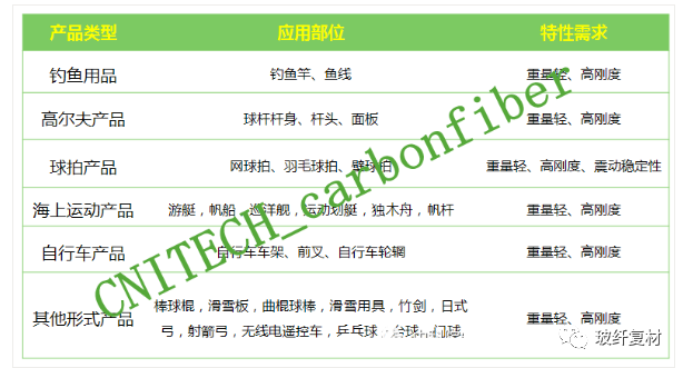 现在,许多球拍、滑雪板、雪橇、曲棍球棍、钓竿、高尔夫球杆、自行车、冲浪板、风筝、鞋子以及其它体育产品均采用了碳纤维。