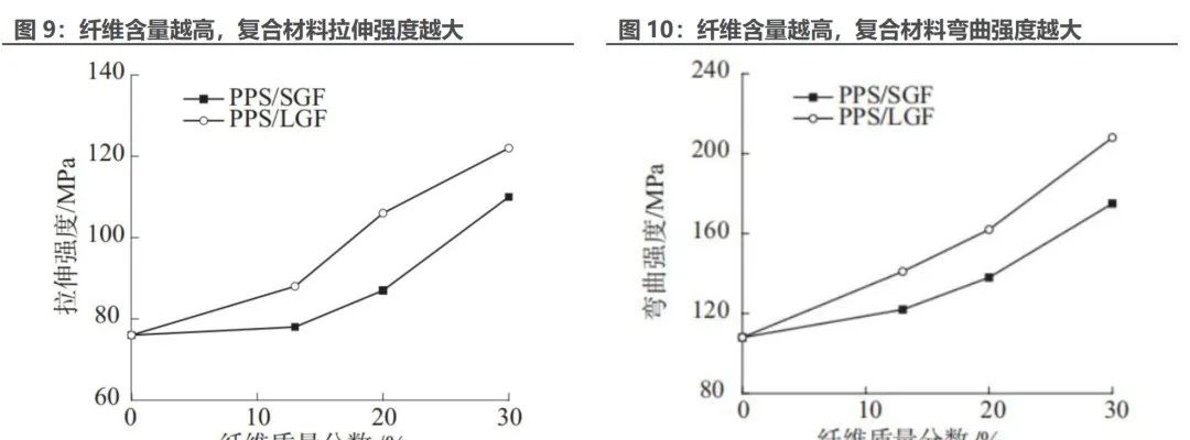 玻纤含量较低时,无法在复合材料中形成较好的应力传递网络,使得玻纤在复合材料受到冲击载荷下以缺陷的形式存在,导致复合材料整体冲击强度降低。随着玻纤含量增加,复合材料冲击强度将会提升。(数据来源:《长/短玻纤增强PPS复合材料的性能对比》)