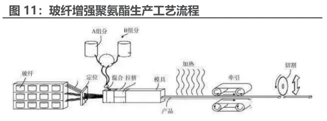 玻纤增强聚氨酯,即GRPU,以无纺玻璃纤维纱为增强材料,聚氨酯树脂为基体树脂,通过注射浸胶拉挤工艺生成。传统树脂拉挤型材时,需使用多达4-5种不同的玻璃纤维毡,且毡需裁切造形。聚氨酯拉挤可用玻纤无碱粗纱来代替玻纤毡,减少原料成本、操作劳力成本,提高生产线速度。