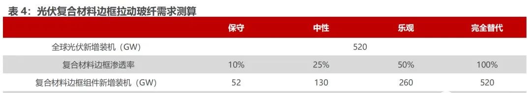 根据表3测算,1GW光伏组件约对应3636吨玻纤需求。Navigant预计2025年全球光伏新增装机520GW,我们按照保守、中性、乐观三种情形,假设复合材料边框渗透率分别对应10%、25%、50%,拉动玻纤需求量18.9、47.3、94.5万吨。2022年我国玻纤产量为687万吨,新增需求占比2.8%、6.9%、13.8%。