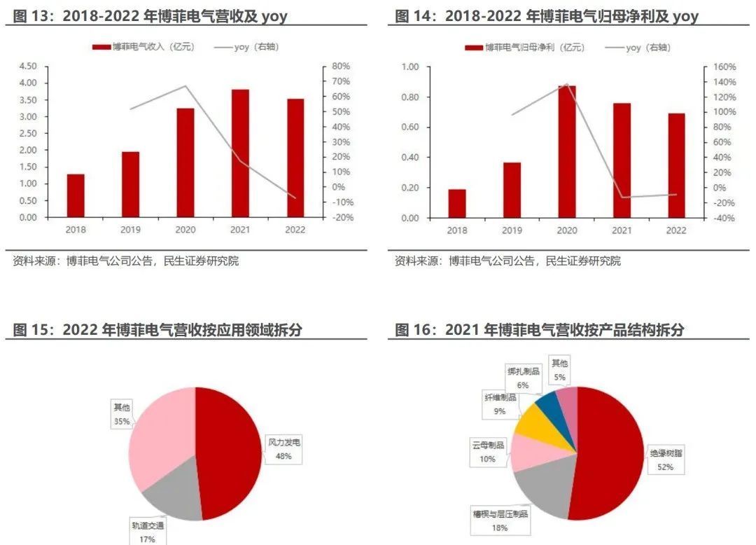 博菲电气深耕电气绝缘材料等高分子复合材料十余年,在树脂开发应用、复合材料制造工艺和性能评定方面具有丰富技术积累。2022年博菲电气收入3.54亿,同比-7.3%,2018-2022年收入CAGR为28.8%;归母净利0.69亿,同比-8.8%,2018-2022年归母净利CAGR为38.8%。应用领域:2022年风电收入占比48%,轨道交通17%;产品结构:2022年绝缘树脂收入占比52%,槽楔与层压制品18%,云母制品10%。