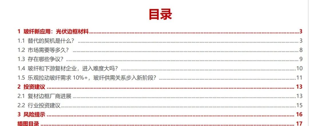 玻纤复合材料用于光伏边框,有了实质进展:振石集团获得全球第一张德国莱茵TÜV集团颁发的光伏组件用复合材料边框证书;行标《光伏组件用玻纤增强复合材料边框》(计划号:2022033-CPIA)(草案稿)由中国光伏行业协会编制,2023年4月20日在常州召开标准启动会。