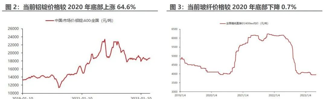 相较铝合金涨幅,玻纤性价比凸显,本轮周期价格波动幅度更小,玻纤本轮周期(2020年后)价格已经创新低。