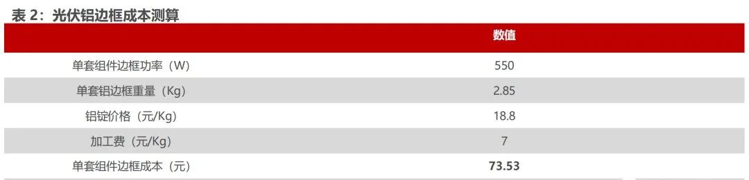 我们根据当前铝价,测算单套组件铝边框成本为73.53元。根据永臻股份招股说明书数据,以P型单晶182mm(M10)电池组件为例,装机容配比1.2、单套组件功率550W。