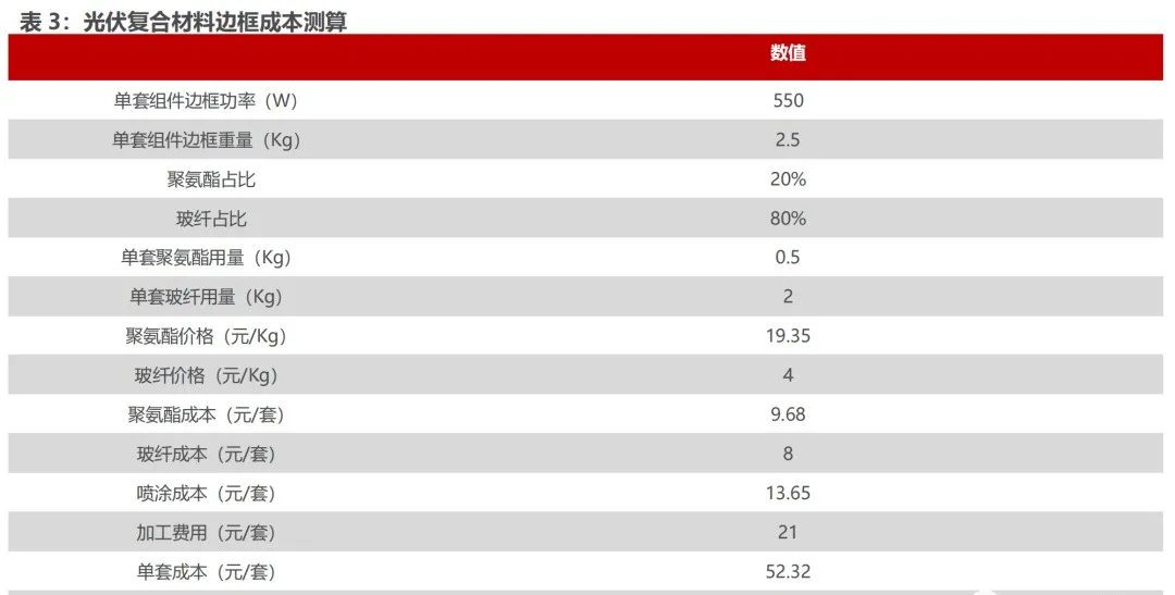 我们根据当前玻纤、聚氨酯价格,测算单套组件复合材料边框成本为52.05元。