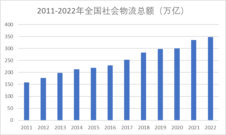 2022年,物流行业继续承担着国内物资调配的“动脉”角色,在抗击疫情,稳定国内国际双循环中起到了至关重要的作用。据统计,当年全国社会物流总额为347.6万亿元,同比增长3.4%。从历年数据来看,仍处于上升态势。
