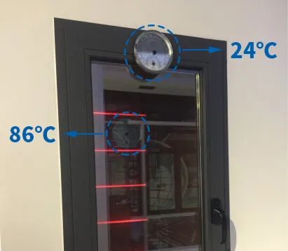 实验可见,室内温度86℃,门窗型材外表面仅为24℃,两者相差64℃。
