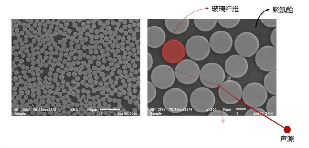 △上图是显微镜下的TICO型材,它主要构成为玻璃纤维+聚氨酯,是非匀质的材料,对声音阻隔有优势!