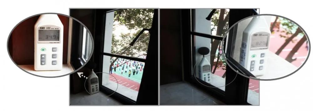 △图中,室外学校操场在进行广播操,从现场检测中可见,室外82.7分贝,室内34.9分贝。