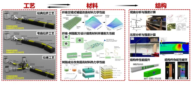 纤维增强复合材料拉挤型材是由纤维增强材料(如玻璃纤维、碳纤维、玄武岩纤维、芳纶纤维等)与树脂基体材料(如环氧树脂、乙烯基树脂、不饱和聚酯树脂、聚氨酯树脂等)经过拉挤工艺制备而成的复合材料(如下图所示)。拉挤型材相比于传统建筑材料(如钢材和混凝土)具有轻质、高强、耐腐、低碳等优点,拉挤型材结构的全寿命周期养护成本也远低于同类型钢结构和混凝土结构,拉挤型材在土木建筑、新能源、机械与汽车制造、航空航天等领域展现出了较强的应用潜力。