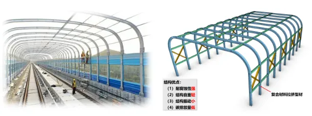 2、城市轨道交通声屏障:结构自重预期降低40~50%,施工便捷、碳排放量低;结构振动小,降低二次噪音;结构在室外环境中耐腐蚀性强,全寿命周期养护成本低;