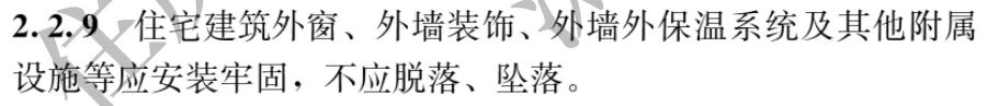 结构抗震等级不低于标准设防类(条款5.0.2),电梯紧急呼叫系统(条款4.2.4)、消防通道无障碍化(条款2.3.7),明确外保温系统防脱落(条款2.2.9)、临空防坠落(条款4.1.16)等细节要求。