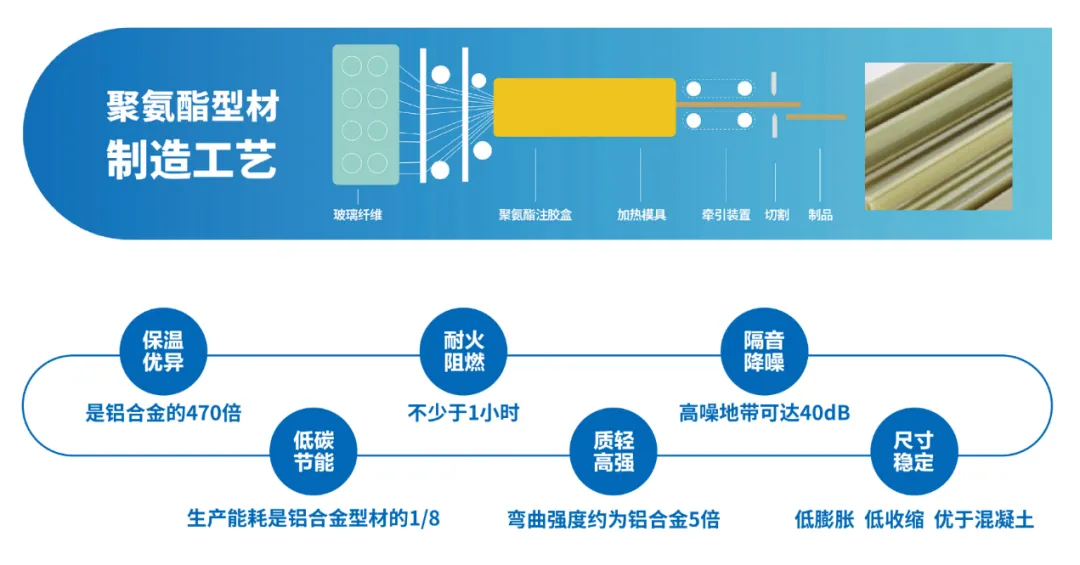 针对规范中门窗脱落(2.2.9)、隔声(6.1.3)等严苛要求,玻纤增强聚氨酯门窗型材展现独特价值: