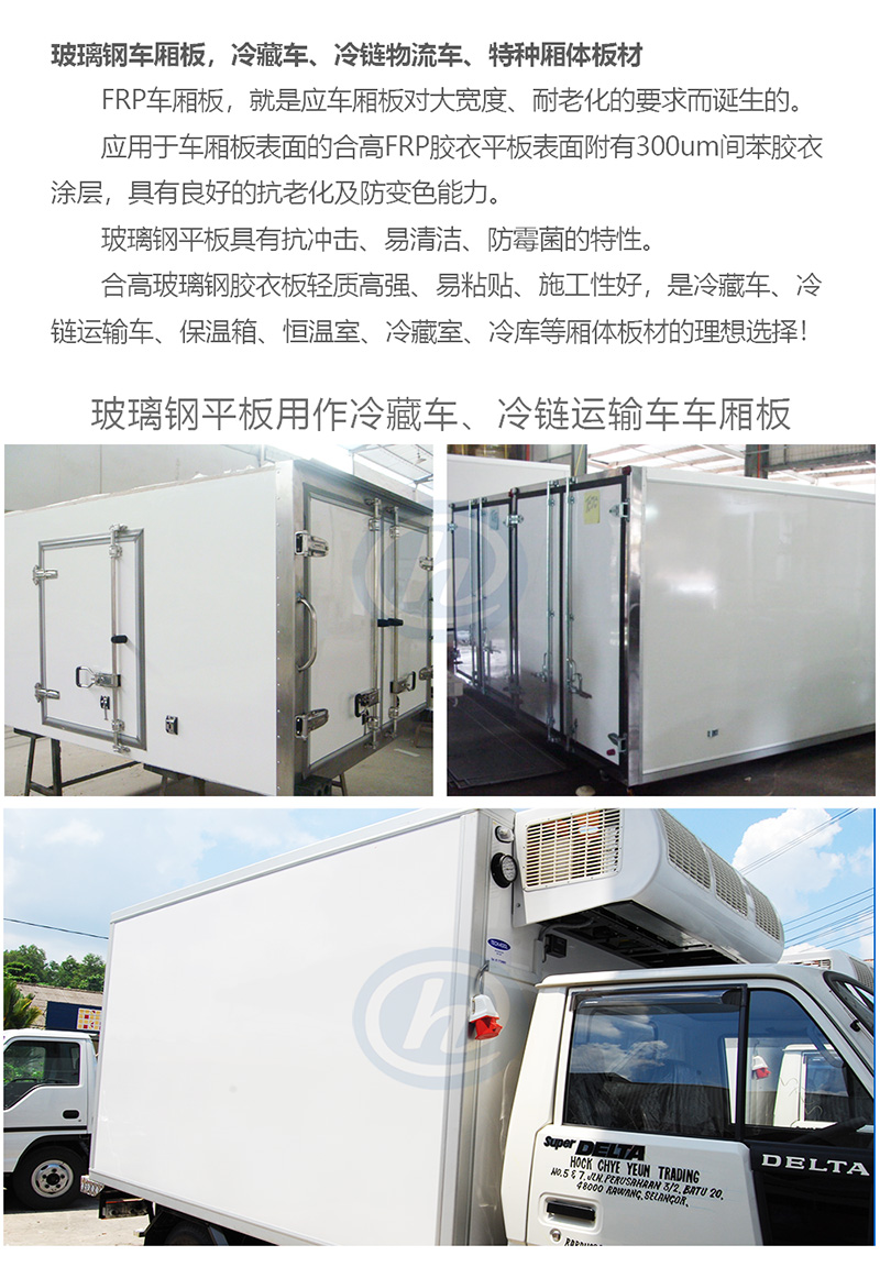 2、FRP内衬板:用于冷藏车、冷链运输车、客车、货柜车厢内衬。