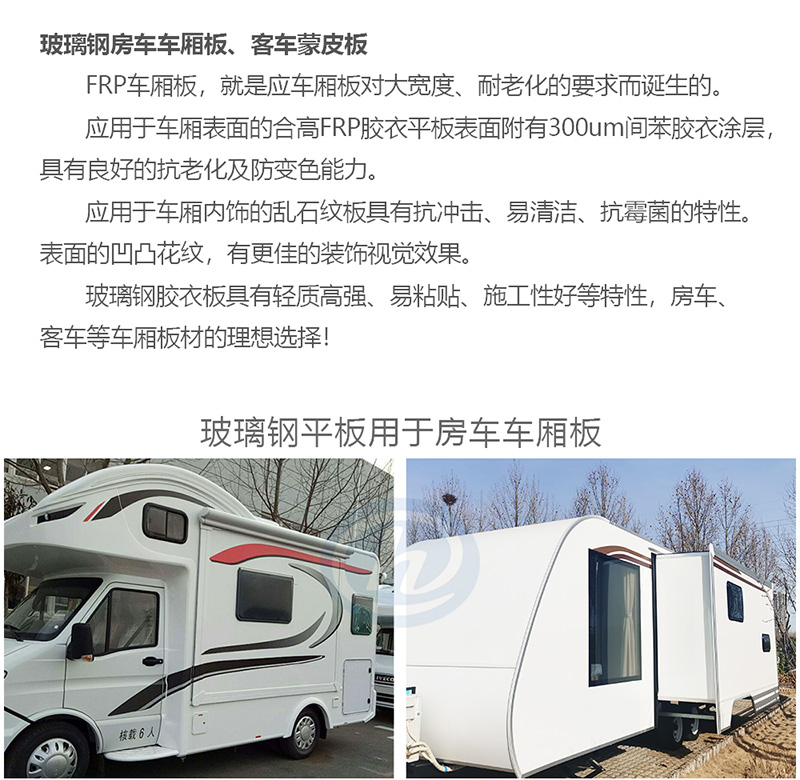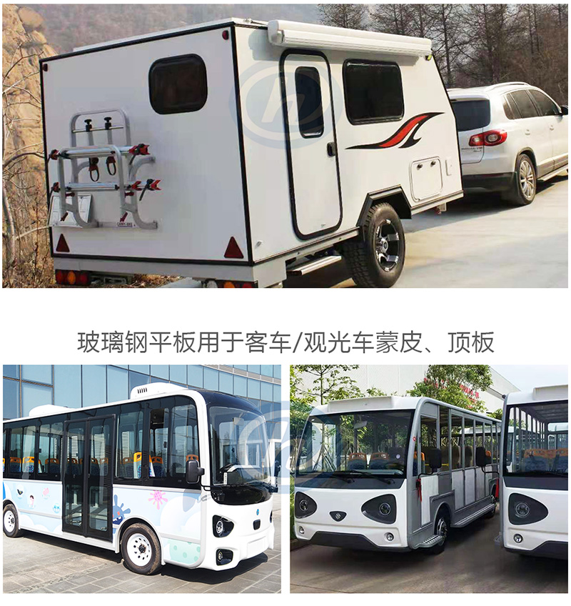 合高主要有四种FRP平板用于房车、客车、货车、拖架车、冷链运输车(冷藏保温车)、集装箱和方舱(通讯、医疗)等特种厢体。
